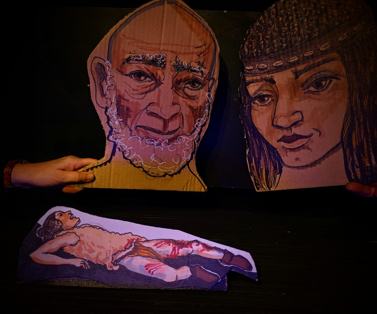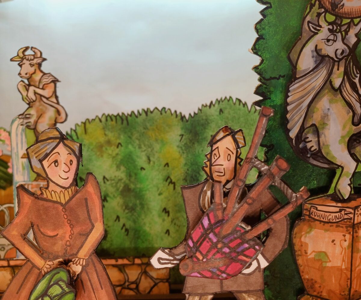 … Lay the bend to the bony broom... An der kargen Nordseeküste lebt eine Gräfin mit ihren zwei Töchtern. Als ein Ritter in ihrem Schloss Quartier erbittet, kommt Streit zwischen den Schwestern auf, denn der Edelmann zieht die Jüngere der Älteren vor. Aus Rache tötet sie ihre Schwester und glaubt auf diese Weise den Ritter für sich gewinnen zu können. Doch drei Hexen erfahren von dem Unrecht und senden eine geheimnisvolle Harfe in das Schloss der Gräfin. Eine im Nordseeraum verbreitete Sage wird hier gleich dreifach verflochten von Hellriegels Junior auf die Bühne gebracht: In gesungener Weise mit Gitarre beglitten, erzählt und auf der Bühne gespielt.