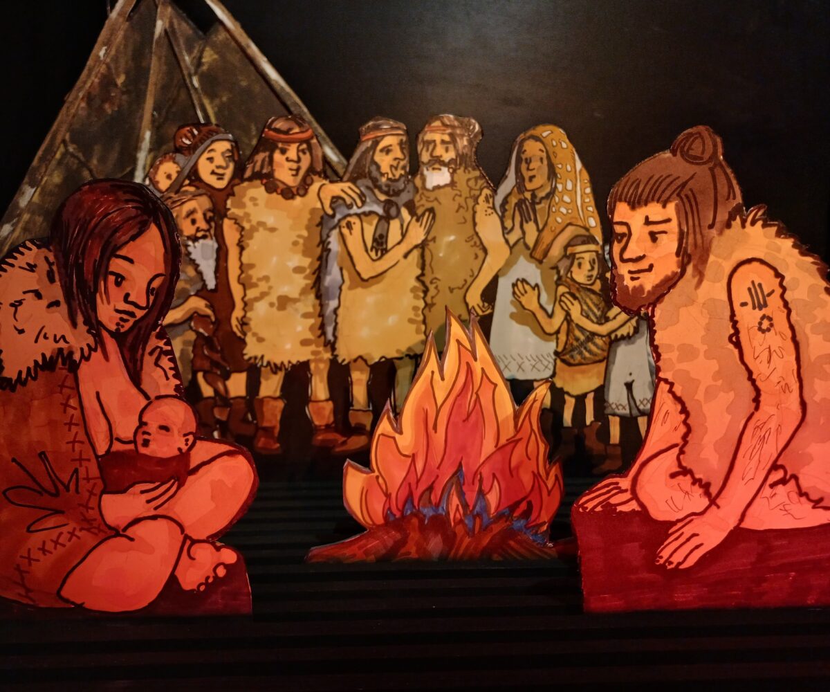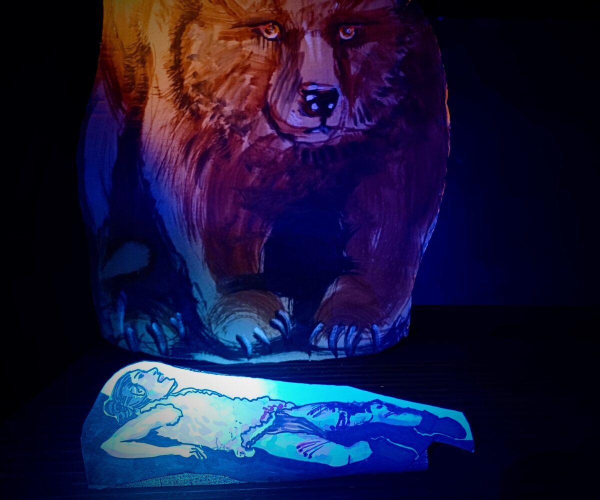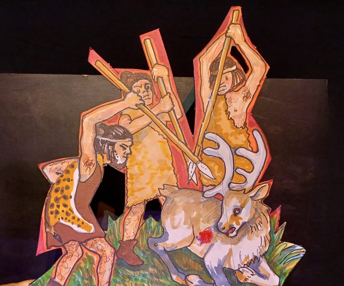 … da spreche ich, der große Bär, zu dem kleinen Menschen... Als der junge Kuro scheinbar gegen die Regeln des Stammes verstößt, muss er sich gegen sein Totem, den großen Bären stellen. Aus dieser Begegnung kommt er nur knapp mit dem Leben davon, erkennt aber seine wahre Bestimmung; er ist kein Jäger, sondern ein Schamane! Auf offener Bühne stellt Hellriegels Junior die Zeit der Steinzeitjäger dar. Die weite Taiga füllt sich mit allen Lebewesen, die mit den Menschen eine Gemeinschaft bilden. Eine spannende Geschichte spinnt sich um Kuro, den großen Bären, eine weiße Hirschkuh und ein junges Mädchen.