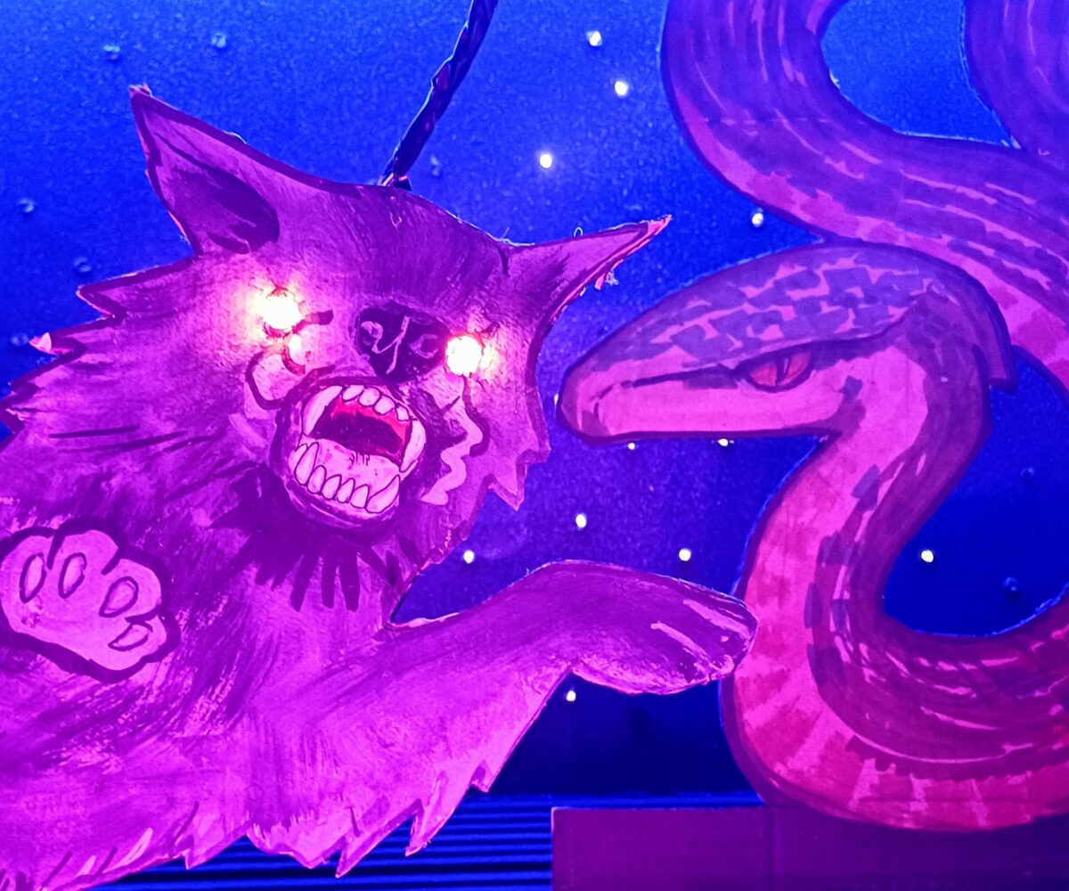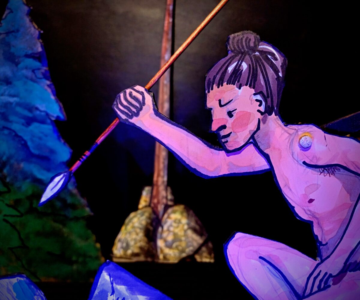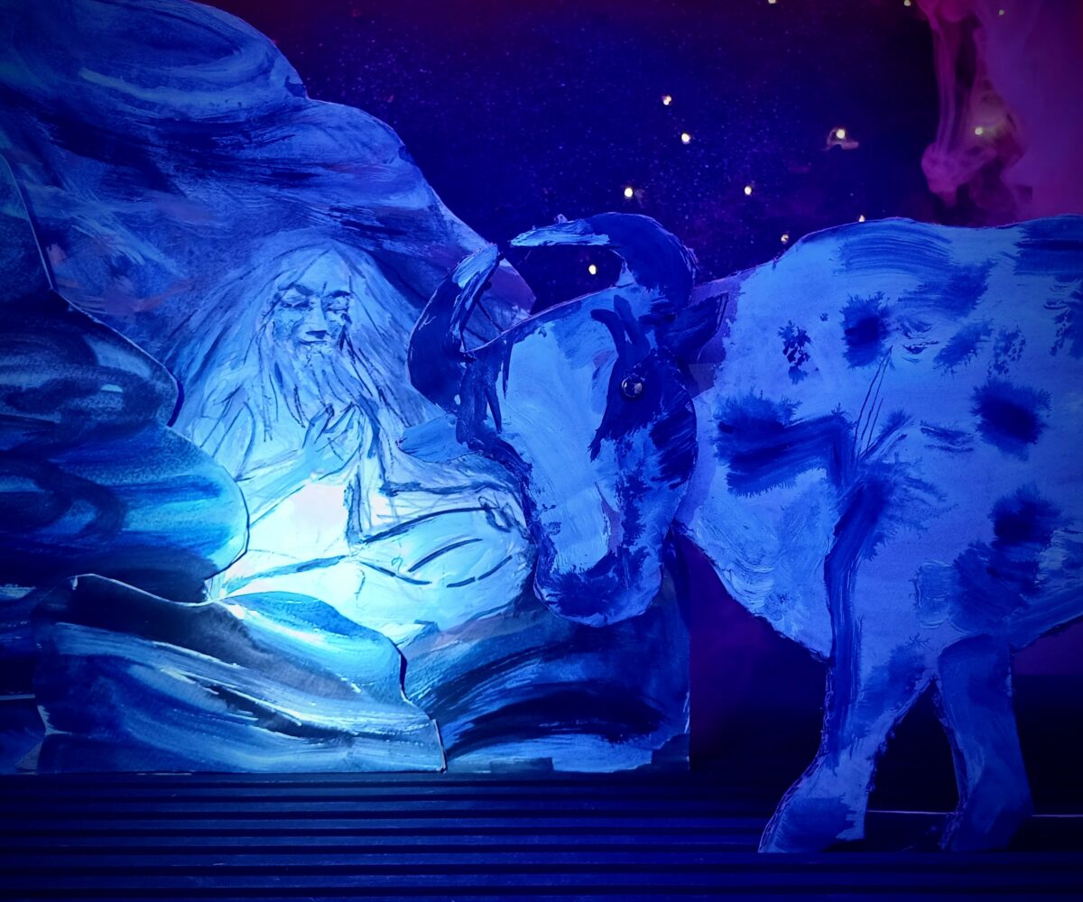 … da spreche ich, der große Bär, zu dem kleinen Menschen... Als der junge Kuro scheinbar gegen die Regeln des Stammes verstößt, muss er sich gegen sein Totem, den großen Bären stellen. Aus dieser Begegnung kommt er nur knapp mit dem Leben davon, erkennt aber seine wahre Bestimmung; er ist kein Jäger, sondern ein Schamane! Auf offener Bühne stellt Hellriegels Junior die Zeit der Steinzeitjäger dar. Die weite Taiga füllt sich mit allen Lebewesen, die mit den Menschen eine Gemeinschaft bilden. Eine spannende Geschichte spinnt sich um Kuro, den großen Bären, eine weiße Hirschkuh und ein junges Mädchen.